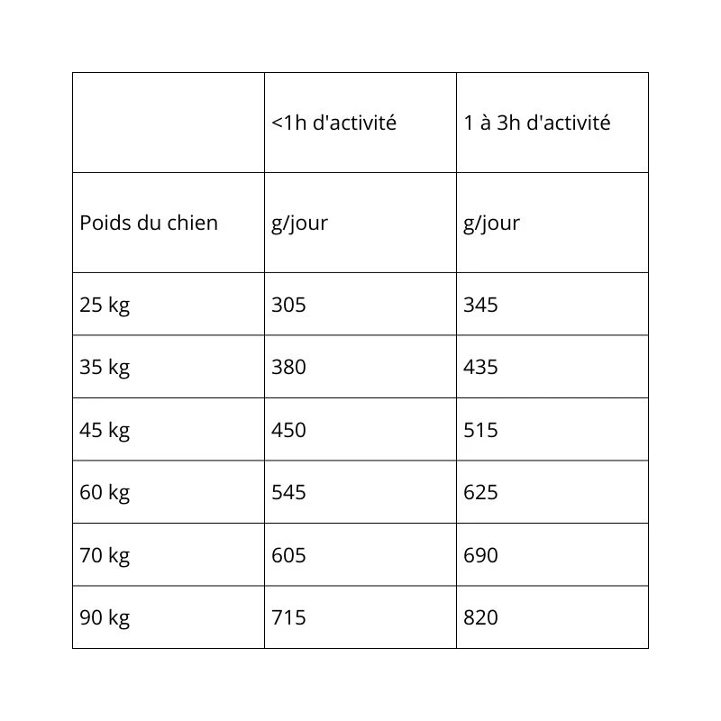 Adapter la ration quotidienne selon le poids, l’activité et la condition physique de votre chien.
